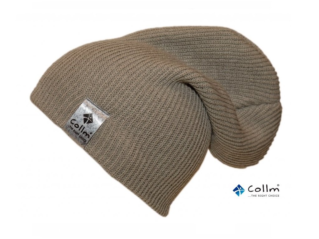 ĽAHKÁ PLETENÁ ČIAPKA COLLM v šedej farbe so striebornou etiketou.