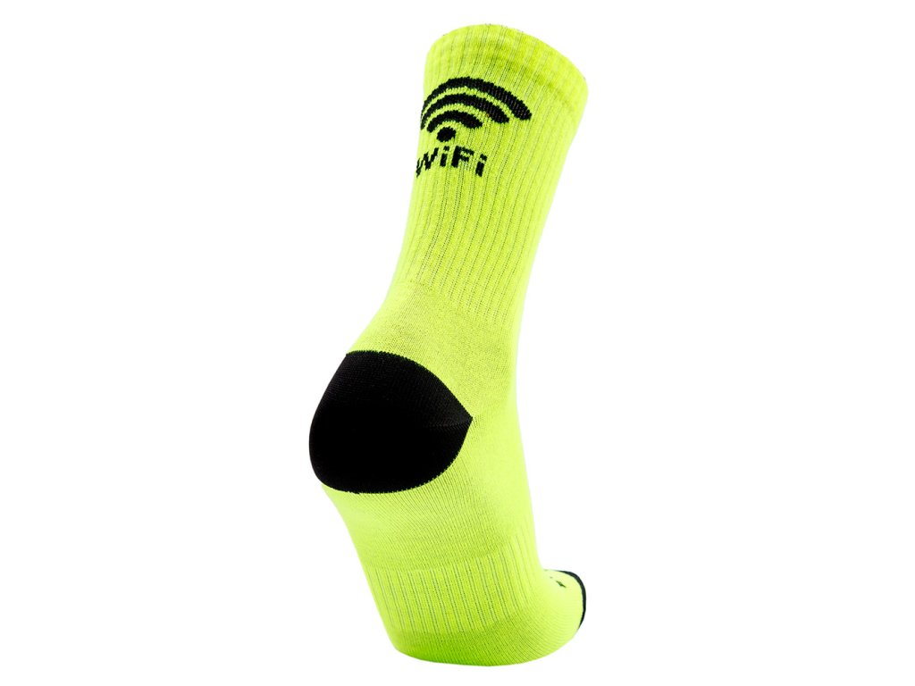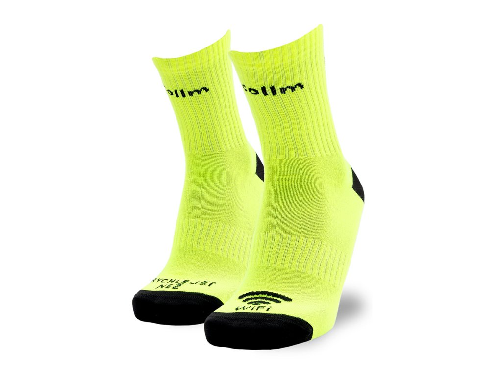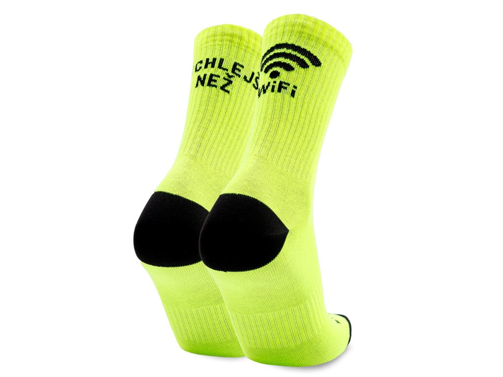 Ponožky rýchlejšie ako WI-FI. Každá ponožka je iná, napriek tomu patria k sebe a tvoria dokonalý pár. Nové originálne ponožky COLLM RÝCHLEJŠIE AKO WI-FI v reflexnej žltej farbe.